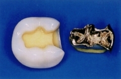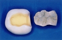 Sie ist ebenfalls zahnfarben, wird aber nach vorheriger Präparation des Zahnes im zahntechnischen Labor hergestellt und in einer zweiten Sitzung mit zahnfarbenen Kunststoff eingesetzt. Sie ist vom natürlichen Zahn praktisch nicht zu unterscheiden und daher die "schönste" Füllungsart. |